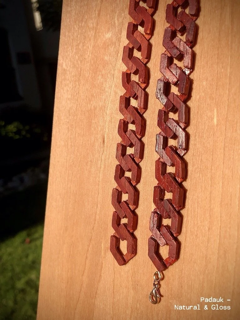 Natural - Mineral oil is used to accentuate the grain of the wood. Additionally, mineral oil is hydrophobic, anti-fungal and anti-bacterial. A mineral oil finish is best for those who wish to have some protection for their chain without sacrificing the real wood feel.